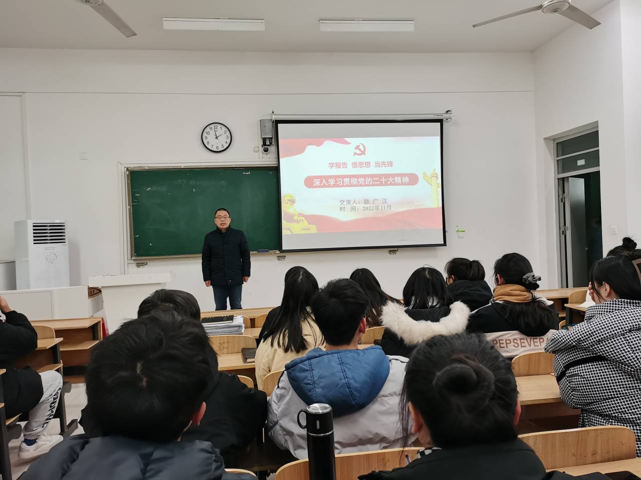 11月30日下午,财经学院党委副书记、纪委书记耿广汉在致知楼C103与经贸学生党支部党员面对面,讲授专题党课,宣讲党的二十大精神。经贸学生党支部书记王天云、学生党员共计80余人聆听党课。