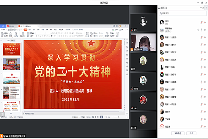 12月19日下午,校辅导员理论宣讲团成员,财经学院纪委副书记、团委书记薛枫为学院2021级财务管理专业学生开展了深入学习贯彻党的二十大精神理论宣讲。
