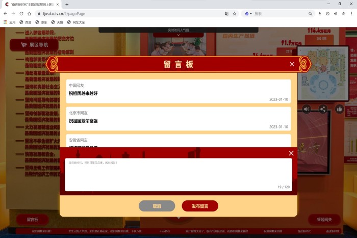同时,财院学生也积极参与网上展馆互动留言,抒发了紧跟总书记、建功新时代、奋进新征程的真挚感言。大家感叹于新时代党和国家事业发展的新局面和新风貌,我们要更加踔厉奋发、勇毅前行,团结奋斗,努力投入学习工作、增长本领,以优异的成绩践行努力献礼祖国美好未来。(特约通讯员:朱中军 摄影:李想 审核:耿广汉)