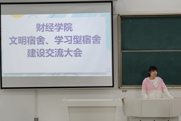 丁雨妍介绍了学校文明宿舍创建标准及评比方法、学习型宿舍评选条件。院自律委员会副部长戴程、刘文倩分别讲解学院查寝办法与《财经学院学生文明宿舍公约》。连续两次次获评校学习型宿舍、文明宿舍的寝室长代表张玉婷从寝室公约、学习目标、值日制度、人际交往等方面分享了学习型宿舍、文明宿舍创建的具体做法和经验。