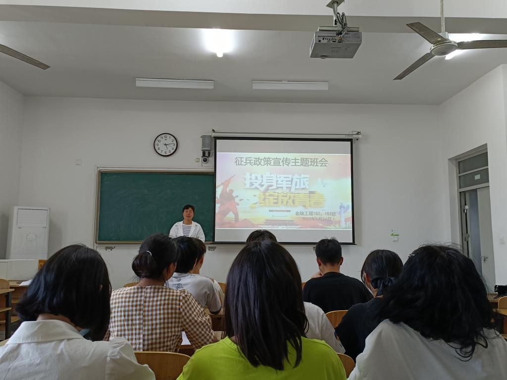 为鼓励毕业生积极参加秋季应征入伍,更好了解秋季征兵工作政策及流程,财经学院各毕业班在5月底至6月初召开大学生应征入伍宣传教育主题班会。