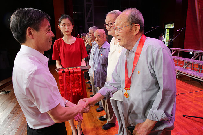 比赛期间隆重举行了安徽科技学院“光荣在党50年”纪念章颁发仪式。党委书记蒋德勤为丁为群、代梅英、仲正林、李庆山、李思义、吴明友、张怀金、张学礼、张景法、陈玉胜、崔贤仪、潘成德等12名在校的老党员代表颁发纪念奖章。为“光荣在党50年”的老同志颁发纪念奖章,是中国共产党成立100周年庆祝活动的重要组成部分。纪念章的颁发,见证着老党员的无悔初心。莫道桑榆晚,为霞尚满天。老党员是党执政兴国的重要资源,是推进中国特色社会主义伟大事业的重要力量。组织上入党一生一次,思想上入党却是一生一世,他们用自己的行动证明了自己的无悔初心。纪念章的背后,是无上的荣光,学校的全体师生也不会忘记他们为学校事业发展所做出的突出贡献。