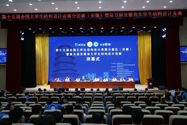 6月27日下午,由安徽省教育厅、安徽省大学生结构设计竞赛组织委员会主办,安徽科技学院、合肥工业大学承办的第十五届全国大学生结构设计竞赛分区赛(安徽)暨安徽省第五届大学生结构设计竞赛在我校龙湖校区图书馆东辅楼报告厅圆满闭幕。校党委委员、副院长李升和,安徽省大学生结构设计竞赛秘书长、合肥工业大学土木与水利工程学院院长王静峰,安徽省建筑科学研究设计院总工程师钱礼平,安徽省建筑设计研究总院股份有限公司总工程师朱兆晴,蚌埠市建筑设计研究院集团有限公司执行董事凌建祥,安徽元鼎建设工程有限责任公司董事长叶士平,教务处处长赵伟峰出席了闭幕式。仪式由建筑学院院长张远兵主持。