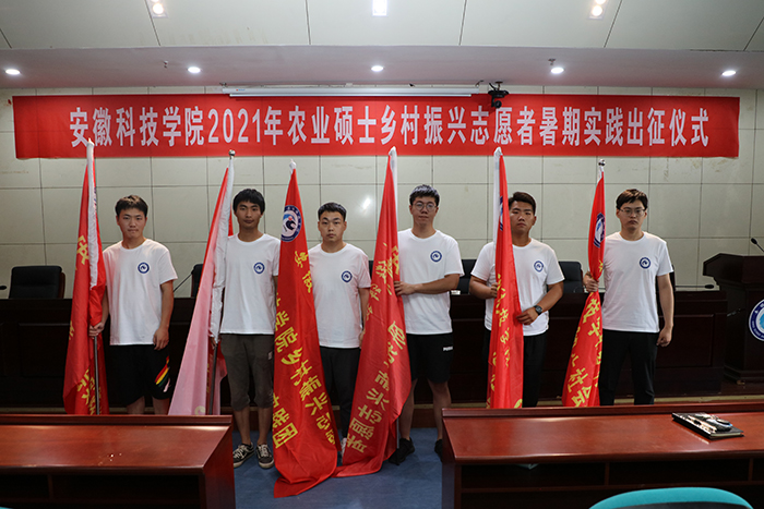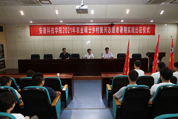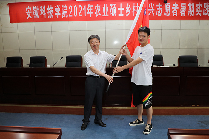 蒋德勤宣布安徽科技学院2021年农业硕士乡村振兴志愿者暑期实践活动正式启动,为8支研究生志愿者实践团队授旗,对各实践团队提出了殷切希望,寄语了美好祝福。