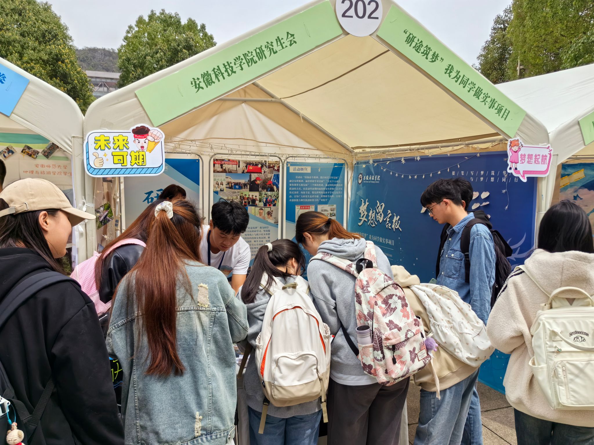 项目交流展示期间,我校研究生会通过精美海报图文等展示了“研途筑梦”项目的全过程,传递了我校研究生会瞄准农科研究生专业实践领域,以“我为同学做实事”实践服务项目为契机,坚持与广大青年学生携手共学、共研、共进,在思想学习与交流碰撞中提振青年时代精神,在科研共进与实践服务中践行青年使命担当。活动现场,还准备了以安科人文风貌为主题元素的明信片、书签等礼品,组织签名留言、主题合影活动,向全国学生展示学校深厚悠久的办学历史与底蕴,传达学校“明德 致知 笃行 创新”的育人理念。