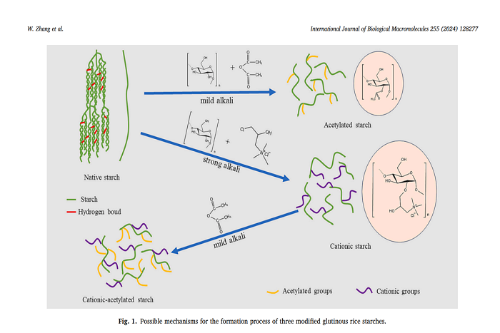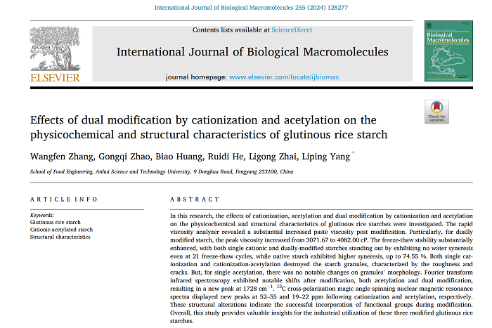 近日,我校2021级食品加工与安全领域研究生张王芬在生化与分子生物学领域Top一区期刊International Journal of Biological Macromolecules(IF=8.2)在线发表题为“Effects of Dual Modification by Cationization and Acetylation on the Physicochemical and Structural Characteristics of Glutinous Rice Starch”的研究论文。食品工程学院粮油及其副产物精深加工团队与营养科技创新团队负责人杨丽萍副教授为通讯作者,安徽科技学院为唯一完成单位。