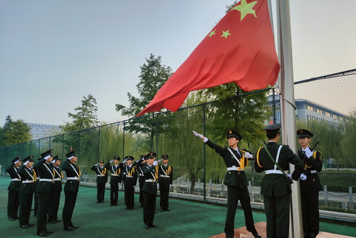 6时40分,升旗仪式正式开始,校国旗护卫队队员昂首挺胸,脚步稳健、英姿勃发,以挺拔俊逸的姿态将国旗护送到升旗台前。伴着庄严的国歌声,一声“敬礼”,护旗手将国旗展向空中,在场所有人肃然而立,向缓缓升起的国旗行注目礼,唱国歌。
