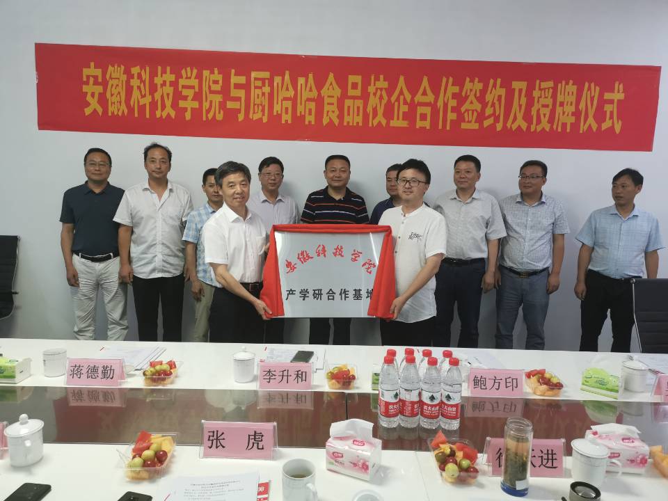 仪式上,蒋德勤向安徽厨哈哈食品科技有限公司颁授了安徽科技学院产学研合作基地、安徽科技学院研究生联合培养基地牌匾。校企双方分别签署了校企产学研合作协议、研究生联合培养基地合作协议和宅食技术合作协议。