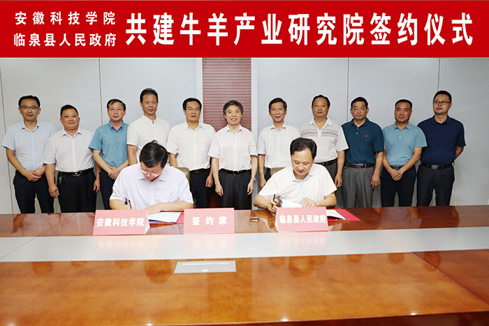 李升和、张亚平分别代表安徽科技学院、临泉县人民政府签署牛羊产业研究院合作协议。