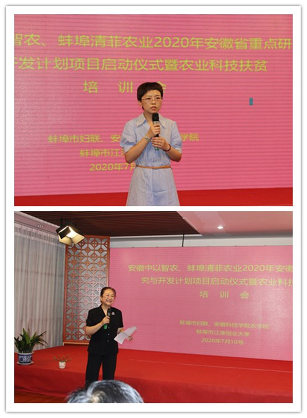 市妇联副主席蒋纹,安徽科技学院农学院院长詹秋文,市科技局农村与社会发展科技科副科长李帆,蚌埠市江淮创业大学、安徽中以智农众创空间有限公司董事长方雯,蚌埠清菲农业科技有限公司董事长翟明安,怀远、固镇、五河三县15个扶贫村村干部及村民代表出席会议。