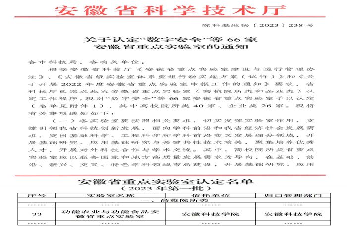近日,安徽省科学技术厅下达了《关于认定“数字安全”等66家安徽省重点实验室的通知(皖科基地秘〔2023〕238号)》,安徽科技学院与合肥工业大学、安徽农业大学合作申报的“功能农业与功能食品安徽省重点实验室”成功获得认定,安徽科技学院长三角功能农业(食品)研究院院长尹雪斌教授担任实验室主任。据悉,这是我国首个融合了功能农业与功能食品完整“创新链”的省级重点实验室。