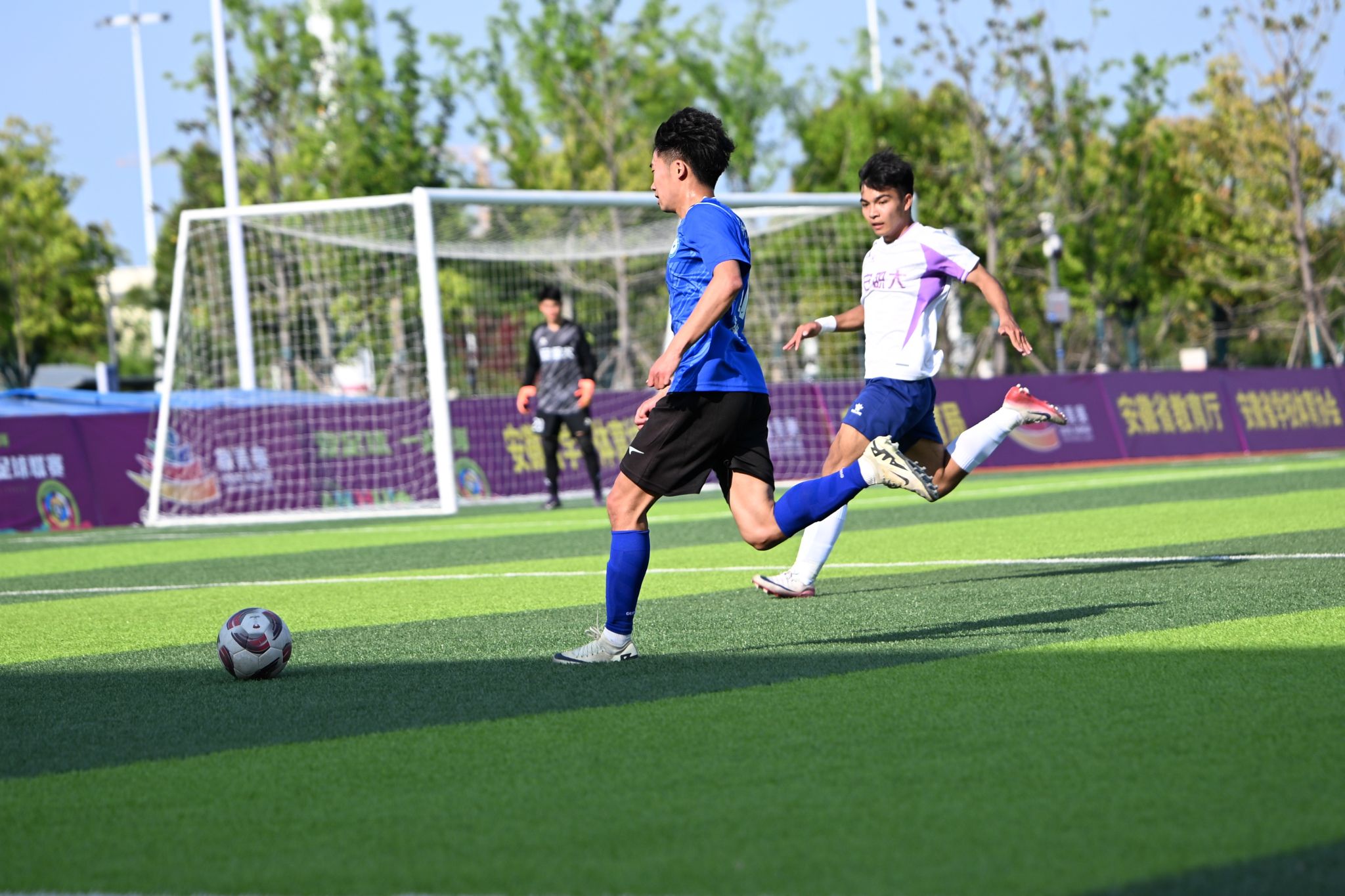 比赛开始后,双方球员迅速进入状态,节奏紧凑,攻防转换快速,展现出双方球队良好的竞技状态与团队协作能力。第7分钟,我校九号球员朱周盛率先破门,场上比分变为1:0。随后对方加强进攻,第22分钟,安职大18号选手一脚远射破门,比分1:1追平。下半场,我校球员稳扎稳打,18号选手许正诚于第78分钟再进一球,最终我校以2:1赢得比赛。