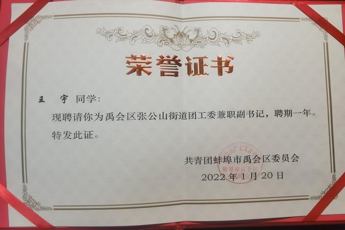信中指出,王宇作为蚌埠籍大学生,能够主动请缨,积极响应号召,在家乡街道任职,在实践中锻炼自我,荣膺担当;思想开路,实干架桥,践行新时代大学生的理想与担当,能够在平日工作里以谦逊平和、踏实肯干的态度去了解群众,运用所学所思去帮助解决居民群众的实际问题,充分展现了安徽科技学院学子的奕奕风采。