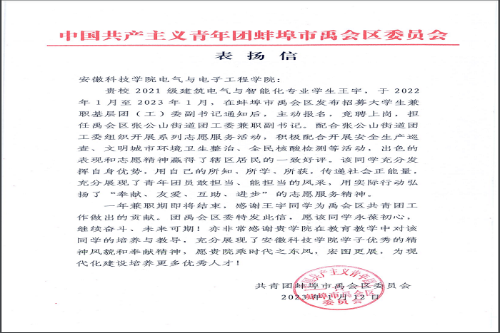 今年2月,一封由共青团蚌埠市禹会区委员会寄出的表扬信送达我校。信中对我校21级建筑电气与智能化212班学生王宇自2022年1月至2023年1月在共青团禹会区委兼职期间的工作表现提出的表扬。
