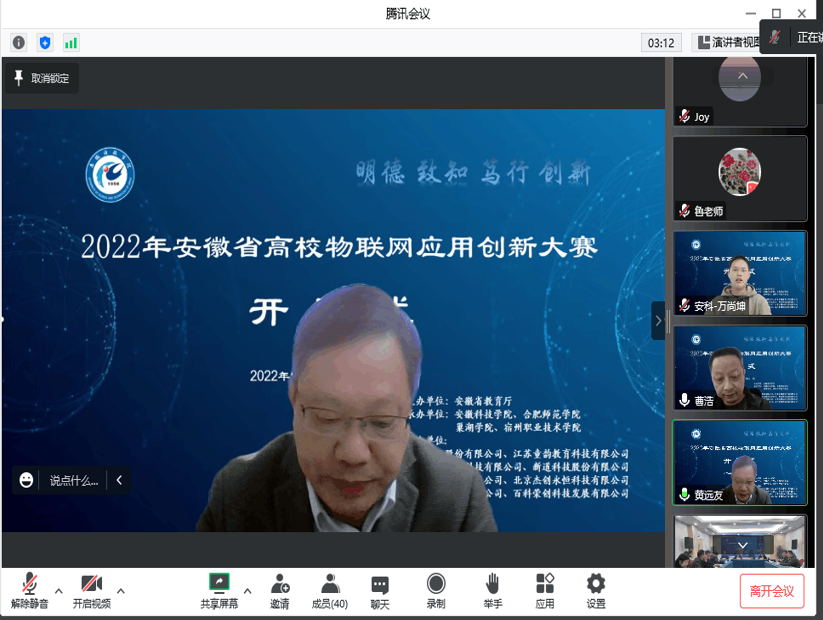 11月13日上午,由安徽省教育厅主办,安徽科技学院信息与网络工程学院承办的2022年安徽省高校物联网应用创新大赛在我校龙湖校区如期举行,我校党委委员、副院长黄远友出席开幕式并致开幕辞。安徽省电子学会理事长吴先良、安徽省计算机学会名誉理事长顾乃杰、安徽省电子学会秘书长陈蕴、安徽省教育厅大创办于嘉怡、大赛专家评委、以及部分参赛师生参加了开幕式,开幕式由信息与网络工程学院院长余宏杰主持。
