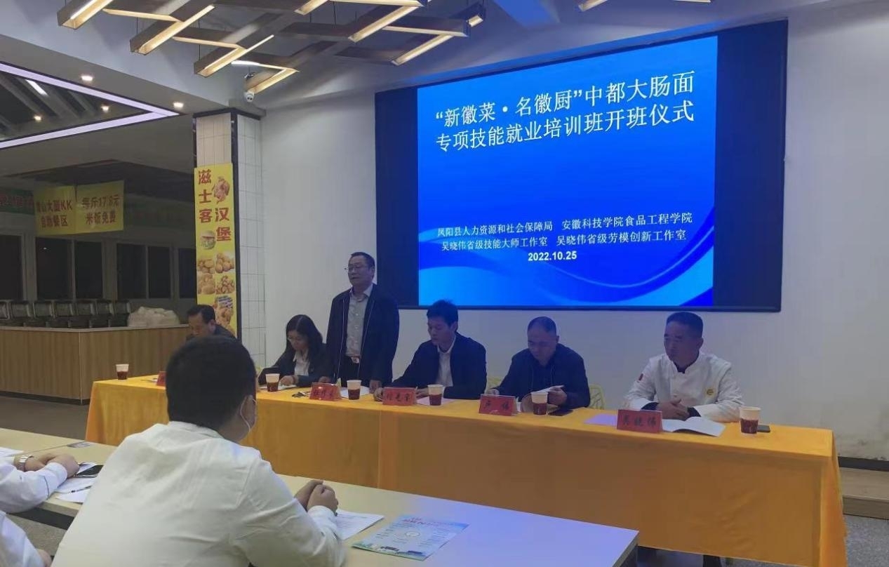 10月25日,凤阳县“新徽菜 名徽厨”专项技能培训班开班仪式在我校东区食堂一楼大厅举行,食品工程学院院长杜传来、凤阳县人力资源和社会保障局局长卢伟、副局长黄娟、职业建设科科长李志、副科长王伟、安徽科技学院后勤保障部饮食服务中心主任韩康、食品工程中心主任吴晓伟及所有参训人员参加了开班仪式,会议由食品工程学院党委书记付光玺主持。