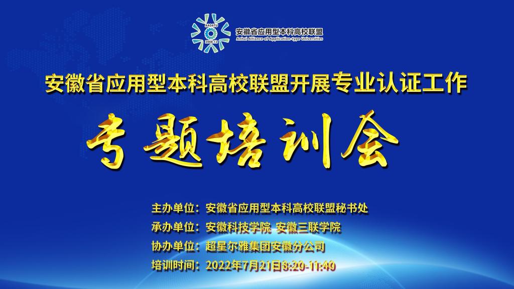 7月21日上午,由安徽省应用型本科高校联盟主办,安徽科技学院、安徽三联学院承办,超星尔雅集团安徽分公司协办的安徽省应用型本科高校联盟专业认证专题培训会在我校成功举行。本次会议采用直播形式进行线上培训,来自安徽省应用型本科联盟24所高校负责专业认证工作的职能部门负责人,相关专业负责人、骨干教师和相关工作人员近600人参会。会议由教务处处长赵伟峰主持。