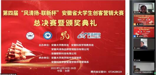 12月25日至26日,第四届“风清扬—联新杯”安徽省大学生创客营销大赛总决赛在云端腾讯会议室隆重举行。此次会议由安徽大学教务处、安徽科技学院教务处、安徽省风清扬品牌管理有限公司(冠名)、安徽联新科技有限公司(冠名)联合主办,安徽大学商学院市场营销系、安徽科技学院管理学院市场营销系联合承办,全省高校31支团队与指导老师一百五十余人参加了大赛总决赛云端仪式。