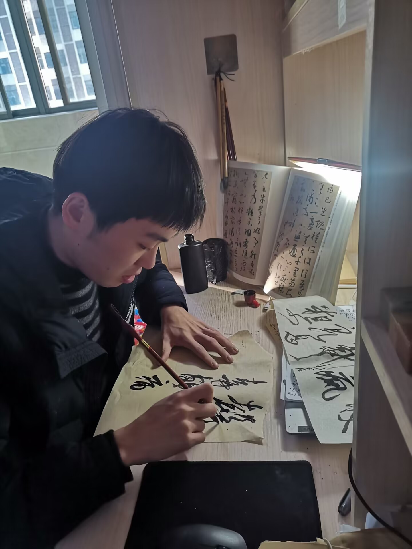 陶乐乐对学习充满热情,善于钻研,乐于将所学的知识融会贯通并总结出一套自己的学习体系来丰富自己的学识境界。他具有丰富的想象力和创造力,在团队设计专利“数字化供水业务服务平台”的过程中,他提出了用“高斯曲线模型”和“数学方位视角”来解决其中一项有关客户体验感提升方法的问题。他曾以个人名义参加了“第二届安徽省大学生品牌创意设计大赛”A类赛事,并取得了省一等奖。他还十分痴迷于书法艺术,尤爱晋唐时期的潇洒书风。在任职“安徽科技学院书美协会副会长”期间,他举办了书法知识竞赛、书法创作分享大会、书法艺术展等多项活动,除此之外,他还计划申请加入中国书法协会。