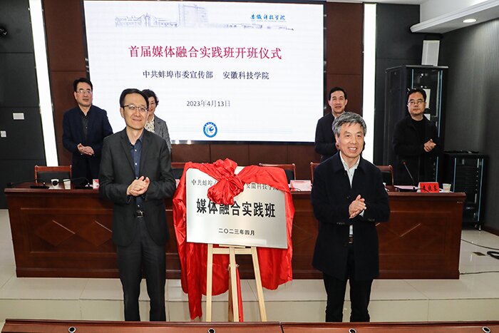 4月13日下午,安徽科技学院首届媒体融合实践班在龙湖校区正式开班。校党委书记蒋德勤,蚌埠市委常委、宣传部部长郭鹏出席开班式,并共同为首届媒体融合实践班揭牌。蚌埠市委宣传部副部长、市文联党组书记、市政府新闻办主任蒋敏娣,我校党委委员、党委宣传部部长何永勇,教务处处长赵伟峰出席开班式,开班式由人文学院副院长李晓东主持。