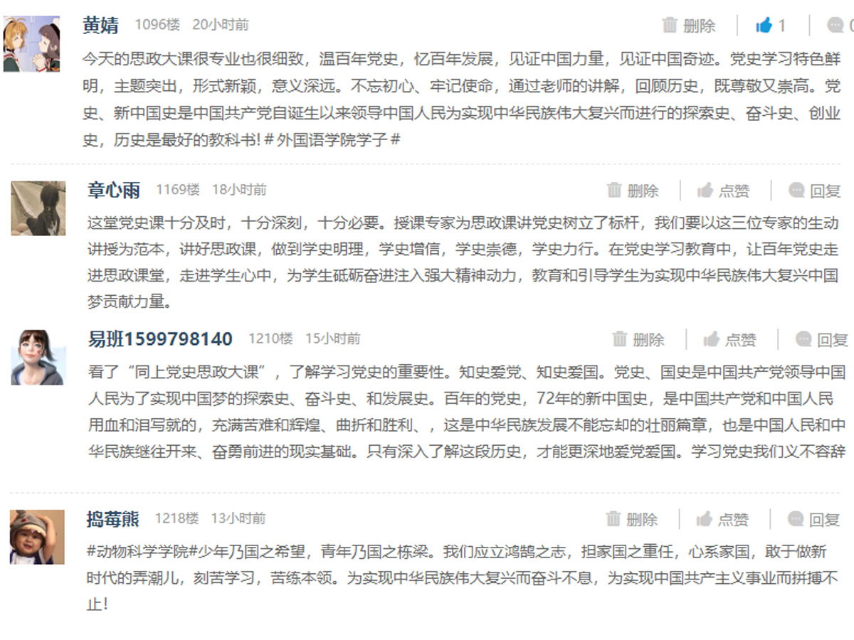 学校通过官网、安科学工微信公众号、安科易班多平台广泛宣传动员,在“安科易班”学习讨论留言板上,师生们反响强烈,踊跃发言,纷纷表达了自己的感想。生命与健康科学学院辅导员邓艳萍表示,通过“同上新中国史思政大课”,更加深刻了解中国共产党为实现中华民族伟大复兴的历史使命。作为一名思政工作者,要紧紧围绕“立德树人”根本任务,寻找“四史”育人的着力点,立足新时代新青年的新特点,让“四史”学习在青年大学生当中“潮”起来,扎根于脑,深铸于心,逐渐转化为大学生投身于伟大共产主义事业的内驱动力,让党的理想信念代代相传。化学与材料工程学院辅导员李潮升表示,此次“思政大课”内容有思想、有文采、有激情,对于我们更好地引领大学生正确认识世界与中国、历史与现实、危机与优势,有着非常重要的现实意义。上好一堂课一定要用学生身边发生的事情去上课,才能更好的感染学生,引起学生共鸣;更要提高理论高度,将鲜活的事例升华以后,才能更好的教育学生。外国语学院学生黄婧表示,今天的思政大课很专业很细致,见证中国力量,见证中国奇迹。通过老师的讲解,回顾历史,既尊敬又崇高。党史、新中国史是中国共产党自诞生以来领导中国人民为实现中华民族伟大复兴而进行的探索史、奋斗史、创业史,历史是最好的教科书。动物科学学院学生顾成霞表示,少年乃国之希望,青年乃国之栋梁。我们应立鸿鹄之志,担家国之重任,心系家国,敢于做新时代的弄潮儿,刻苦学习,苦练本领。为实现中华民族伟大复兴而奋斗不息,为实现中国共产主义事业而拼搏不止!(特约通讯员:石志成 审核:何永勇 编辑:张威 )