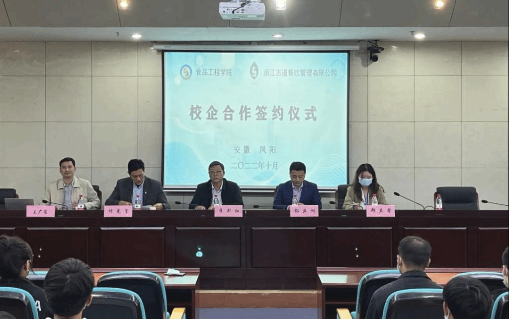 为完善产学研合作机制,实现优势互补、合作双赢,10月13日下午,食品工程学院与浙江古道餐饮管理有限公司在凤阳校区图书馆一楼会议室举行校企合作签约仪式。校党委委员、副院长李升和,浙江古道餐饮管理有限公司董事长、总经理彭亚洲出席仪式。签约仪式由食品工程学院党委书记付光玺主持。