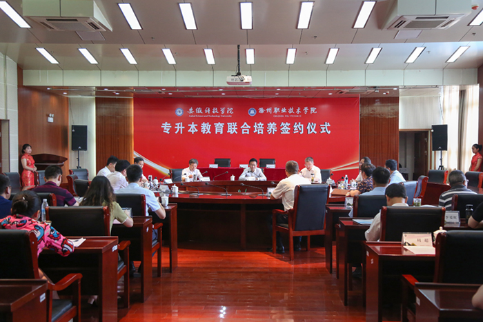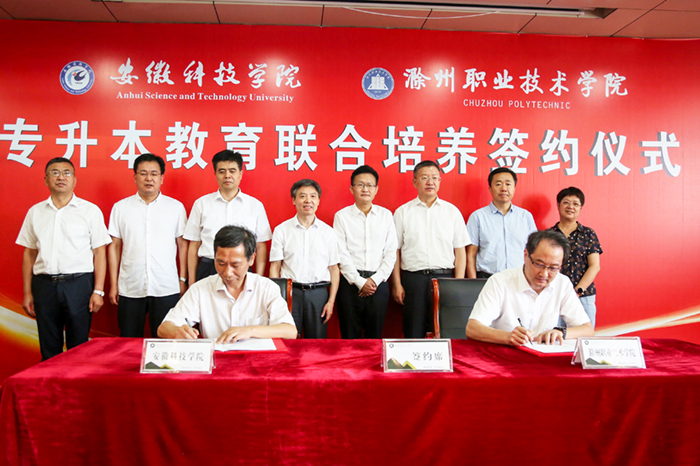 7月21日,我校与滁州职业技术学院专升本教育联合培养签约仪式在该校隆重举行。校党委书记蒋德勤,党委副书记、校长李震,党委委员、纪委书记、监察专员王强,党委委员、副校长黄友锐,滁州市政府副市长陆峰,滁州职业技术学院党委书记曹付忠,党委副书记、校长许雪峰,党委副书记杨家庆,党委委员、副校长江洁,党委委员、校长助理、招生就业处处长穆松及两校相关职能部门和二级学院负责人参加了签约仪式。