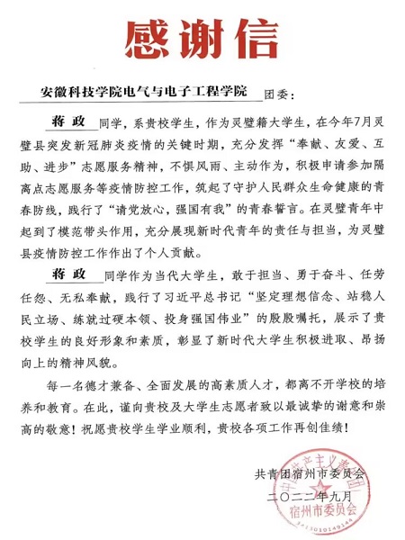 10月初,共青团安徽科技学院电气与电子工程学院委员会收到一封来自共青团宿州市委员会的感谢信。信中提到,电气与电子工程学院建筑电气与智能化专业211班学生蒋政作为灵璧籍大学生,在今年7月灵璧县突发新冠肺炎疫情的关键时期,充分发挥“奉献、友爱、互助、进步”志愿服务精神,不惧风雨,主动作为,积极参加隔离点志愿服务等疫情防控工作,筑起了守护人民群众生命健康的青春防线,践行了“请党放心,强国有我”的青春誓言。