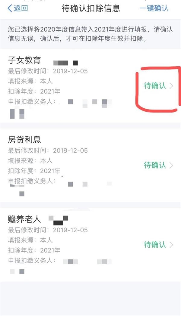3.打开“待确认”状态的专项附加扣除,核对信息;如有修改,可以点击“修改”,信息确认后点击“一键确认”。(如有“已失效”状态的信息,则需先删除之后才能点击“一键确认”)。