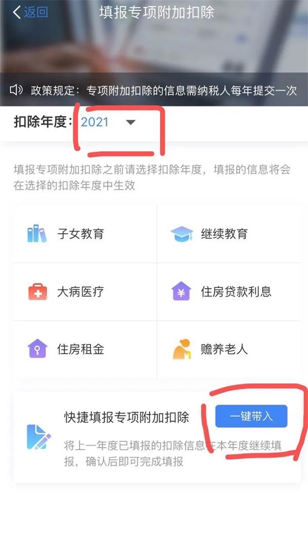 1.打开个税App首页,显示2021年度专项附加扣除专题,直接进入选择“扣除年度”,然后“一键带入”。