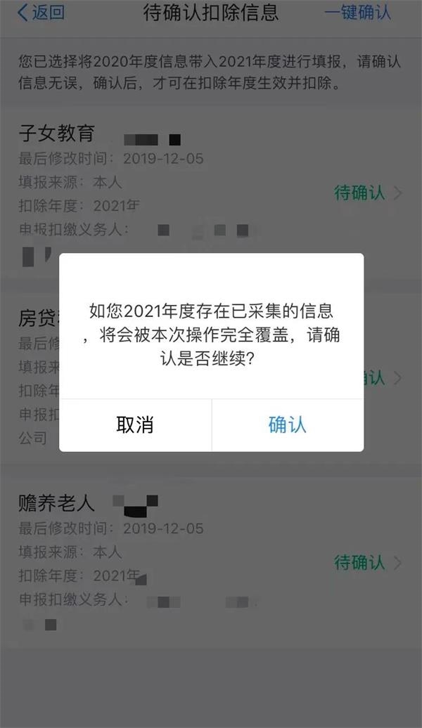 2.依据提示“将带入2020年度信息,请确认是否继续?”或者“您在2021年度已存在专项附加扣除信息,如果继续确认,将覆盖已存在的专项附加扣除信息!”,确认后点击“确定”。