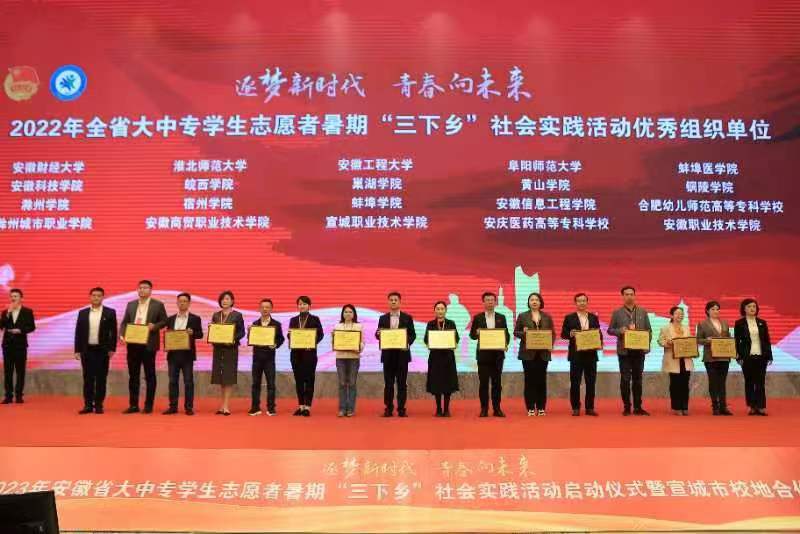 会上,我校被授予2022年安徽省大中专生学生志愿者暑期“三下乡”社会实践活动优秀组织单位,宣城市委组织部同时向驻我校人才工作站授牌。