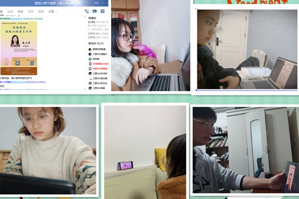 为进一步提升心理干部的工作能力和服务水平,切实增强面对疫情和突发状况时的心理调节能力,更好地服务学生,维护社会安全稳定,根据学院假期思政教育和心理育人的相关安排,2022年1月22日晚上七点到八点半,管理学院在智慧树平台积极组织蒲公英心灵社成员和各班心理委员参加了由西安交通大学、北京高教学会心理素质教育研究分会等联合承办的“京陕抗疫”心理讲堂系列公益讲座。本次讲座由陕西师范大学心理健康教育指导中心副教授毛志宏副教授主讲,题为“疫情期间的心理委员工作与自我关怀”。