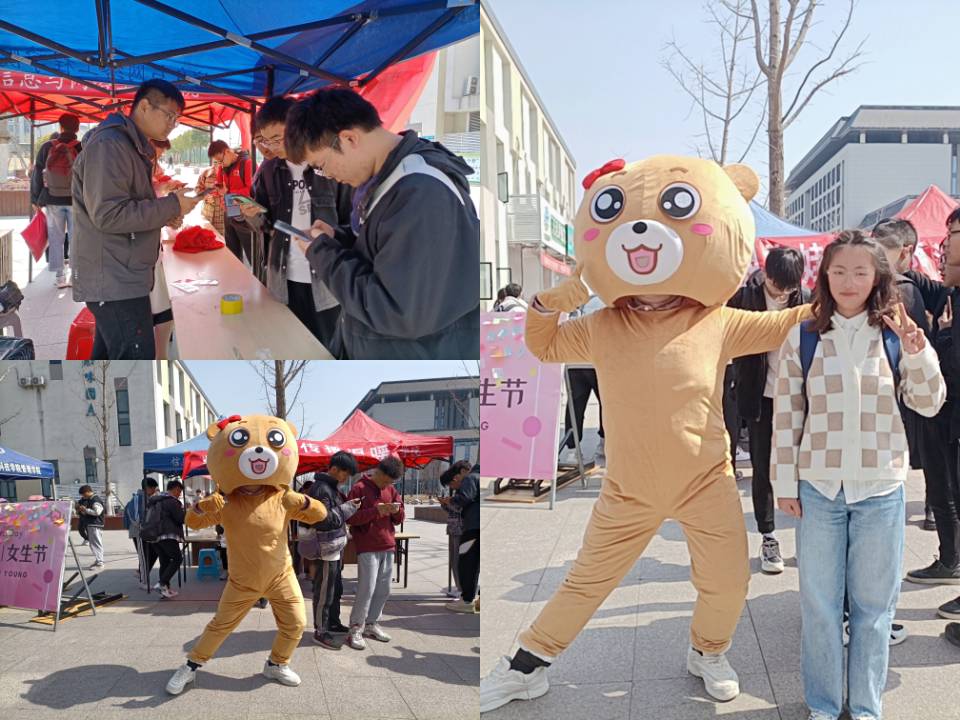 为了让全校女生们更好地感受节日的气氛,享受节日的祝福,在女生节活动期间,志愿者们穿上了可爱而俏皮的人偶服装,与经过的女生们进行拥抱、合照并送上祝福。可爱的人偶引起了强烈的反响,一个温暖的拥抱关怀,一句最真诚的祝福,吸引女生们纷纷参与进来,为女生节增添了一抹靓丽的色彩,让女生们感受到来自学校、学院的温暖和关怀,提高女生们的安全感和幸福感。