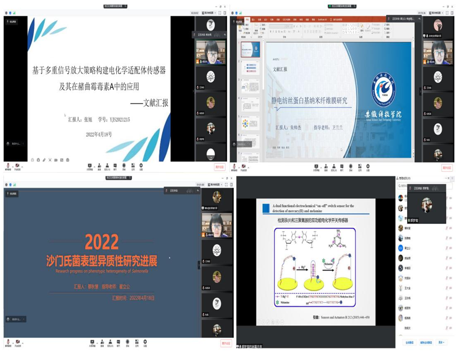 四位研一的研究生分别以《静电纺丝蛋白基纳米纤维膜研究》《基于多重信号放大策略构建电化学适配体传感器及其在赭曲霉毒素A中的应用》《沙门氏菌表型异质性研究进展》、《三维有序多孔材料电化学适配体传感器的构建及其在食品中重金属检测的应用研究》为题,着重对研究课题近期的进展状况、研究过程中所遇到的问题和困难以及近期取得的成果进行汇报。与会人员交流了各自看法和不同见解。