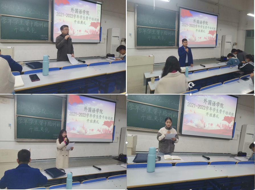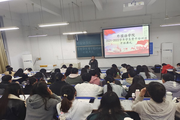 为提升学生干部的责任感和使命意识,增强为同学服务的本领,外国语学院于11月14日晚在求知楼A座106教室举行学生骨干培训班开班典礼,学院党委副书记张海亮、团委副书记宋兵兵、专职辅导员张薇薇出席开班典礼,学院分团委全体成员,学生会、易班工作站部长及以上成员、19-21级各班主要班委参加,此次开班典礼由宋兵兵主持。