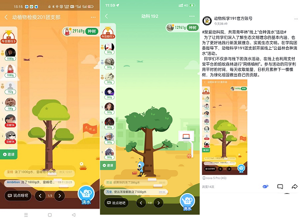 各班级同学们积极加入“线上云植树”活动。依托支付宝蚂蚁森林平台,同学们通过绿色出行、在线缴费、循环利用、减纸减塑等低碳行为,积累虚拟的“绿色能量”,作为虚拟树长大的营养。虚拟树种类丰富,有沙漠植被之王梭梭树、植物化石胡杨、防风固沙的沙棘等等。随着能量增加,虚拟树得以逐渐长大。公益组织、环保企业等蚂蚁生态伙伴们可以“买走”用户在蚂蚁森林里种植的虚拟“树”,在阿拉善、酒泉等沙化地带种下一棵实体树或守护相应面积的保护地,以培养和激励用户的低碳环保行为。“云植树”让植树活动不仅仅局限在3月12日,而是发生在每一天。