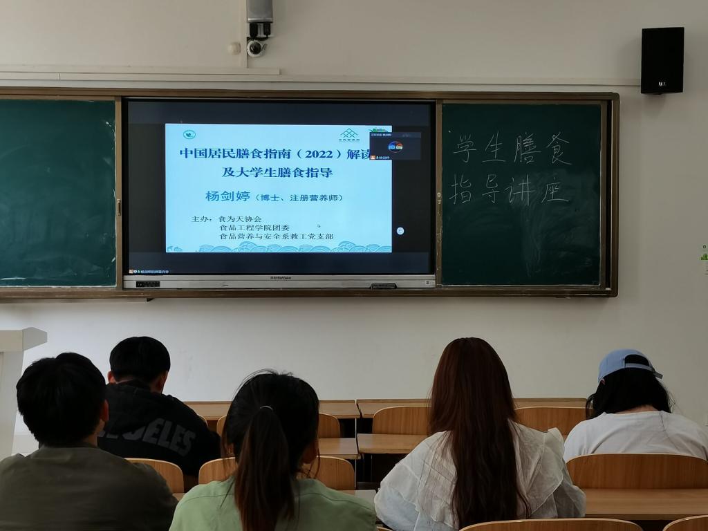 在2022年全民营养周和中国学生营养日来临之际,为提高全民营养意识,提倡健康生活方式,树立科学饮理念,5月18日,食品工程学院食品营养与安全系教工党支部联合院团委、食为天协会在凤阳校区多功能教室共同举办了《中国居民膳食指南(2022)解读及大学生膳食指导》讲座。活动以线上和线下结合的方式面向两校区开展。食品营养与安全系教工党支部书记杨剑婷博士担任主讲。