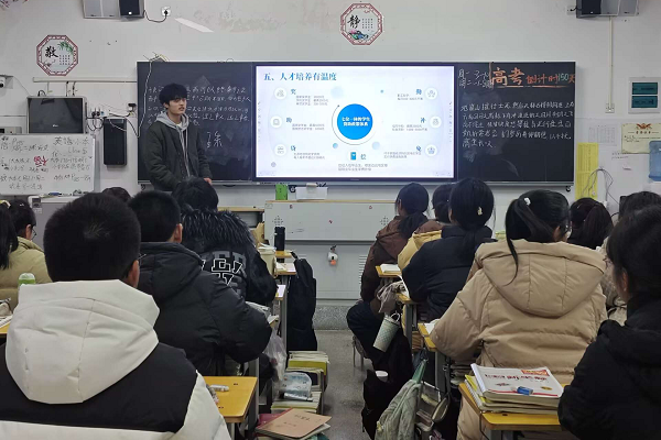 回母校的第一站,团队成员先看望了高中班主任和任课老师,对学校及老师的培养表示感谢。随后,在老师的带领下,团队成员来到老师现在所带班级,并以PPT讲解的形式展开此次活动。他们向同学们介绍了学校的历史背景、学科优势、教学质量和办学特色,其中详细介绍了自己所在专业的课程设置、学术氛围和校园文化。随后,他们结合自己在大学的所见所闻和经历,介绍了我校的各类学生活动和课外文化。在交流中,他们积极回答同学们的问题,并分享了自己在大学的学习经历和收获。