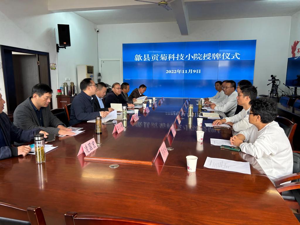 授牌仪式前,校地双方进行了座谈交流。张春雨介绍了学校的办学特色以及学科专业、师资队伍建设及人才培养等方面取得的成果。学校办学历史悠久,多年来扎根农业、农村和农民中,为地区农业发展作出了重大贡献。张春雨指出,歙县“贡菊科技小院”是由国家三部委(教育部、农业农村部、中国科协)支持建设,安徽科技学院通过派驻研究生、研究生导师,解决歙县贡菊产业发展中的瓶颈问题,推广农业新技术,为歙县贡菊产业发展作贡献。