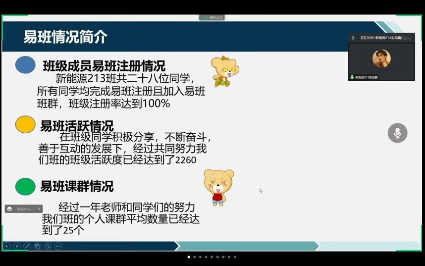 本次评选活动共有16个班级参加。评选会上,各班级汇报人围绕班级参与学校及学院易班活动的参与情况、获奖情况、班级特色易班活动开展情况、易班工作的不足及下学期工作规划等多个方面进行了汇报,对各班级易班建设取得的阶段性成果都给予了充分展现。最终,应用化学211班、应用化学223班脱颖而出,获得本次评选活动一等奖。李潮升肯定了各班级开展易班建设所取得的成果,鼓励各班级在下学期继续将易班与班级活动有机结合起来,通过发挥平台优势,更好地开展班级特色活动,不断提升网络育人实效。