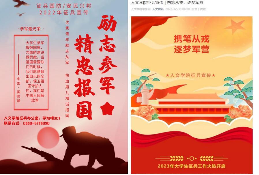 学院利用网络平台,多次推送大学生征兵宣传的内容,提高宣传实效。此外,我院开通线上线下咨询热线,人文学子可通过热线,咨询征兵信息。