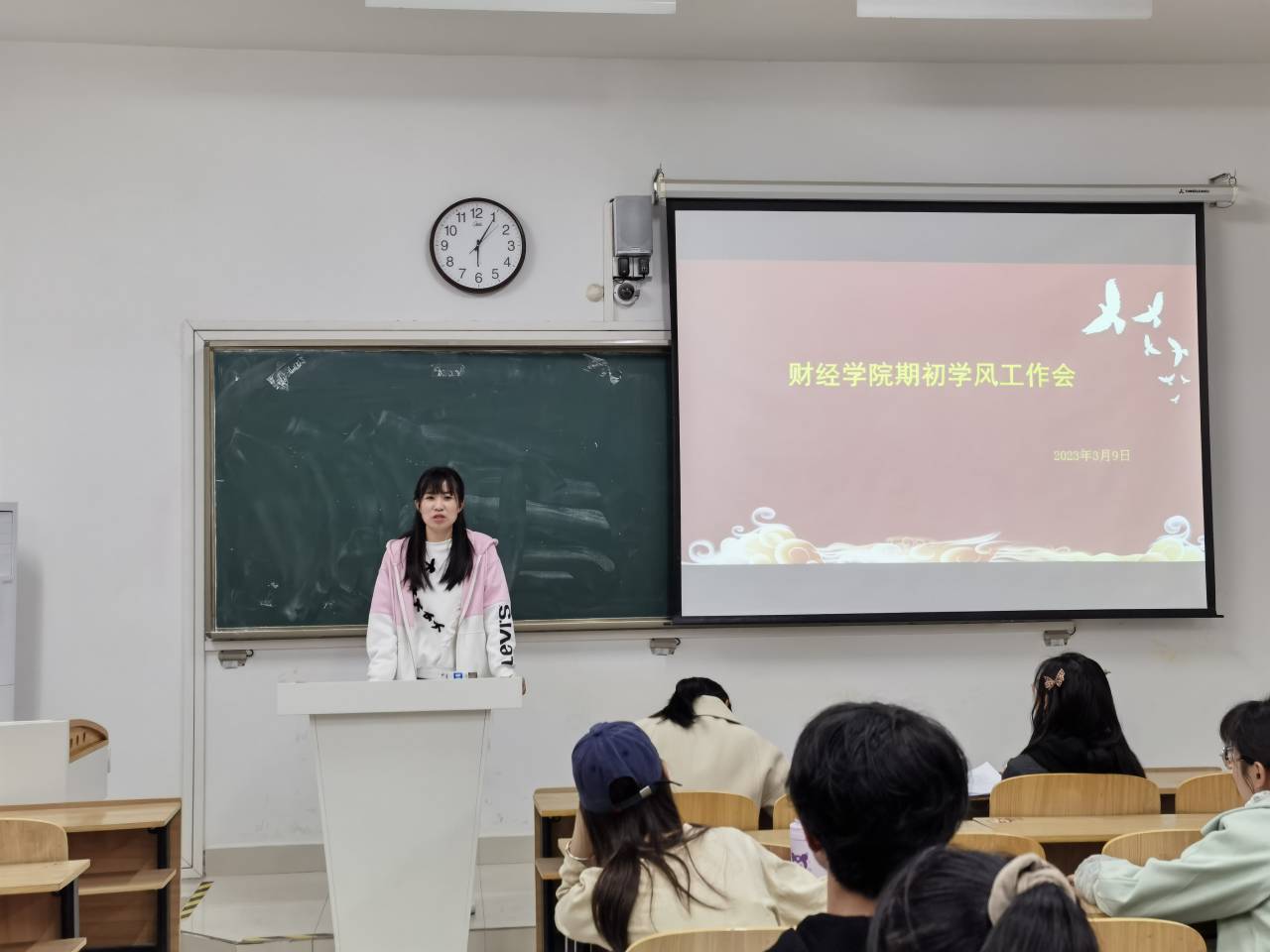 宣晶晶对本学期学风建设相关工作作了部署,重点围绕日常考勤、课堂学风督查、晚自习督查等几个方面。她要求学习委员做好班级同学与学院、教师之间沟通的桥梁,进一步严肃课堂考勤,与学院和任课教师形成工作合力,共同营造优良学风。