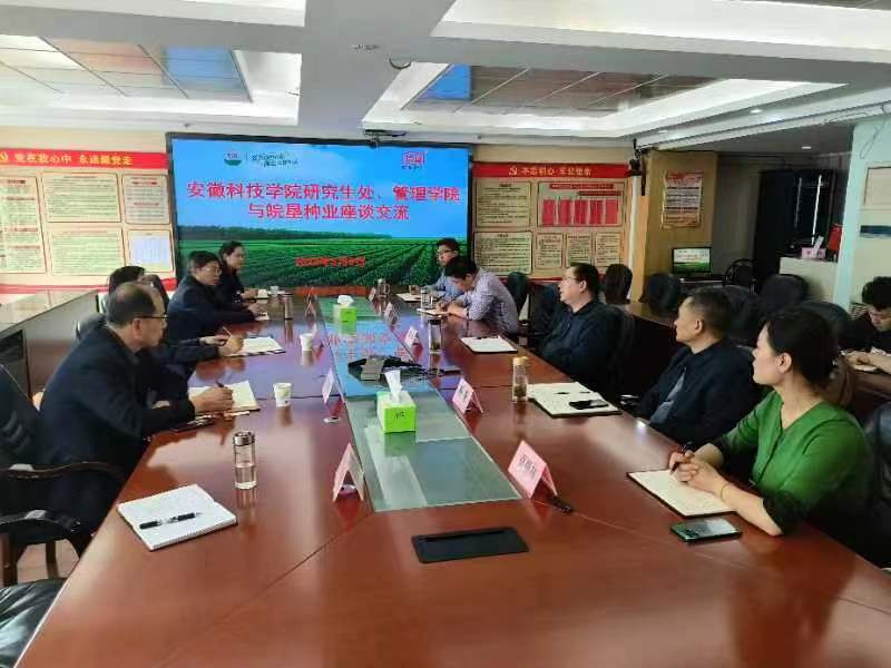 陈军董事长对调研组一行表示热烈欢迎,并就皖垦种业概况、发展历程、主营业务和战略规划等方面进行了详细介绍。党委副书记杨奎、副总经理孟凡东、围绕公司“育繁推管一体化”分别介绍了皖垦种业的科研育种、种子生产、营销工作、内控管理等情况。张春雨处长和陈传万院长分别代表学校和管理学院详细介绍了安徽科技学院办学历程、研究生教育和管理学院办学及人才培养情况。双方围绕农业管理专业研究生实习、市场营销专业人才精深培养及校企合作等事宜开展了充分协商。双方均表示将在研究生实习实训基地建设、人才培养改革、企业冠名班设立、科学研究等方面积极探索,逐步建立全面的、长期的、紧密的产学研合作关系,助推校企实现双赢共赢。