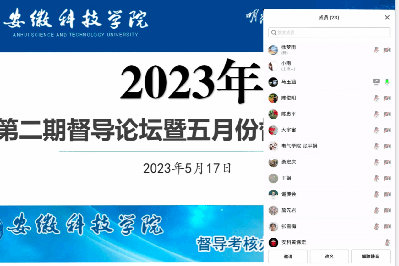 为加强教学督导与教学质量监控工作、保障学校教学工作顺利进行,提升教育教学质量,5月17日下午,督导考核办公室利用腾讯会议平台,举行第二期期督导论坛暨五月份教学督导线上工作会议,全体校督导员、院督导组成员及督导考核办公室工作人员参加了会议,会议由督导考核办公室徐梦雨老师主持。