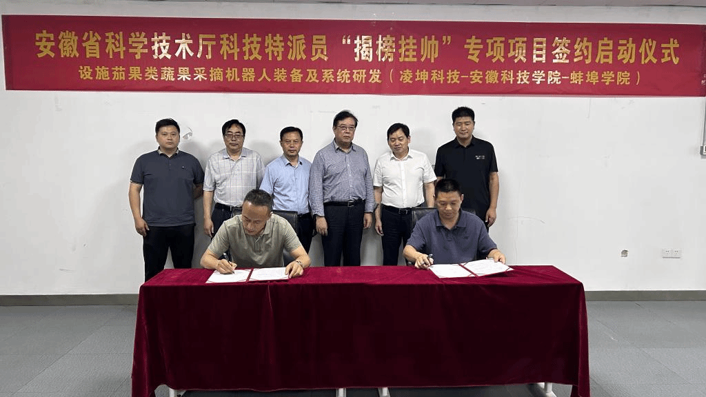安徽省科学技术厅科技特派员“揭榜挂帅”农业物质技术装备专项项目,属于安徽省科技重大专项项目,我校机械工程学院材料成形及智能装备团队申报的“设施茄果类蔬果智能采摘机器人装备及系统研发”获批立项,这也是安徽科技学院首次获批省级揭榜挂帅项目;该项目省级支持资金100万,地方按照1:1配套资金。6月2日,发榜方和揭榜方在安徽凌坤智能科技有限公司举行项目启动和各方责任履约签约仪式,蚌埠市科技局副局长杨怀波、安徽科技学院科研处处长陈丰、安徽凌坤智能科技有限公司董事长潘成刚等参加签约启动仪式。