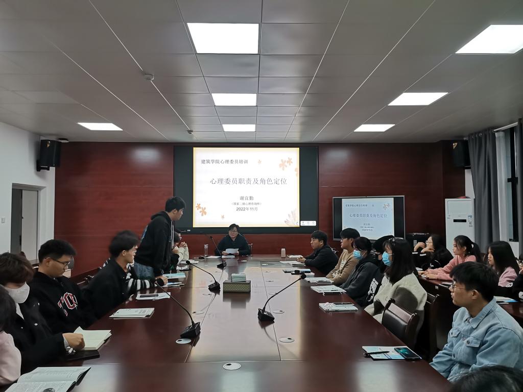 为进一步推进大学生心理健康教育工作,提高心理委员工作水平,11月13日下午建筑学院于尚行楼A301开展心理委员专题培训。本次培训由建筑学院党委副书记、国家二级心理咨询师谢宜勤老师主讲,2021、2022级各班心理委员及学院心理联合会部分成员参加。