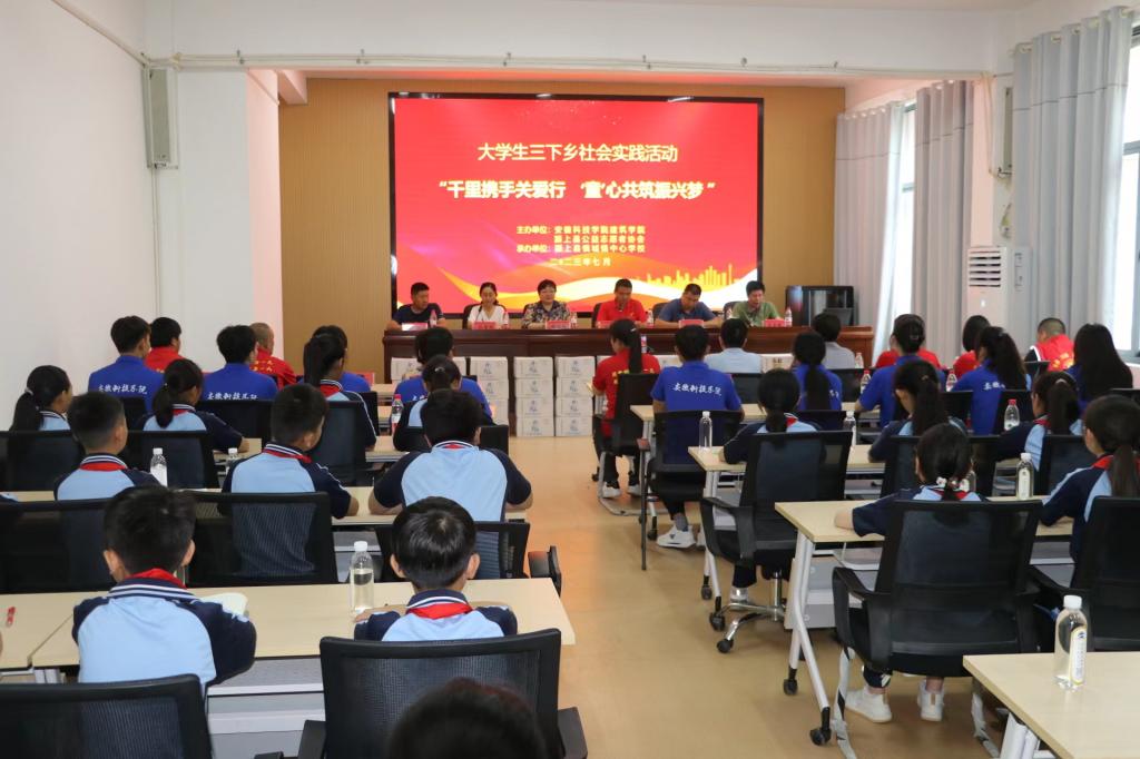 为深入学习贯彻习近平新时代中国特色社会主义思想,强化在实践中受教育、长才干、做贡献,7月15日上午,由安徽科技学院建筑学院和颍上县公益志愿者协会主办,颍上县慎城镇中心学校承办的“千里携手关爱行,‘童’心共筑振兴梦”暑期社会实践启动仪式如期举行。建筑学院党委副书记谢宜勤、团委书记沈德艳、团委副书记武辉一行三人前往参加。启动仪式由颍上县公益志愿者协会会长、“中国好人”获得者汤锋主持。