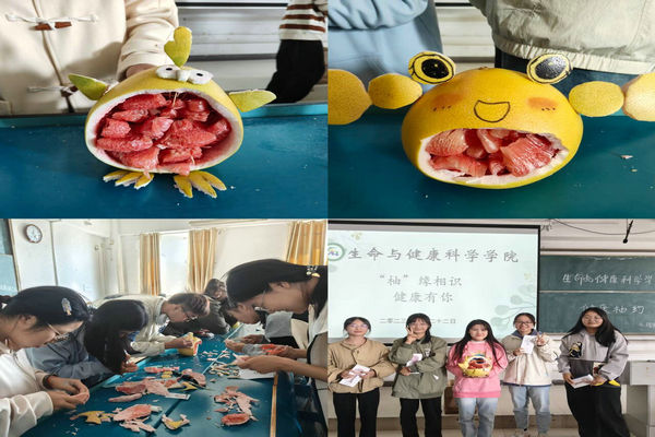 10月22日上午,生命与健康科学学院心理委员联合会组织23级新生于新知楼B304教室举行健康“柚”约剥柚子比赛。赛前积极宣传,同学们踊跃报名组建团队,利用各种工具雕刻出创意图案。中药学(卓越班)231“海底小纵队”获得第一名;药物制剂231“柚,柚,柚队”获得第二名;生物科学(对口)232“碱基互补配队”获得第三名。比赛过程中,同学们团结合作、相互鼓励,不仅提高了动手创作能力,也增进了沟通交流,建立深厚友谊。