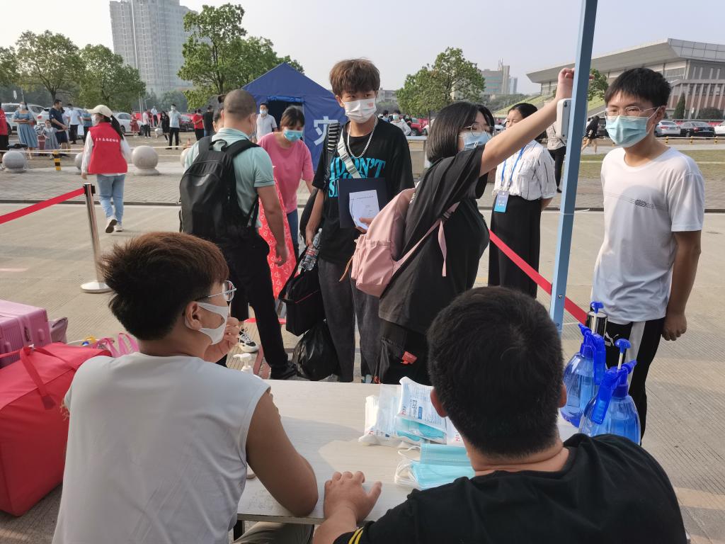 迎新现场工作人员有条不紊地展开迎新工作。辅导员与新生密切联系,不时通过QQ、电话等方式了解新生的行程和位置,确定报到时间并给予乘车指导。新生到校后,志愿者们热情上前接过家长手中的行李,引领新生消菌杀毒、更换口罩,出示核酸检测报告、行程码、返校通行证、通过面部识别再前往检录处进行检录,上交材料后领取宿舍钥匙和校园卡。最后由志愿者带着行李引导新生前往宿舍。